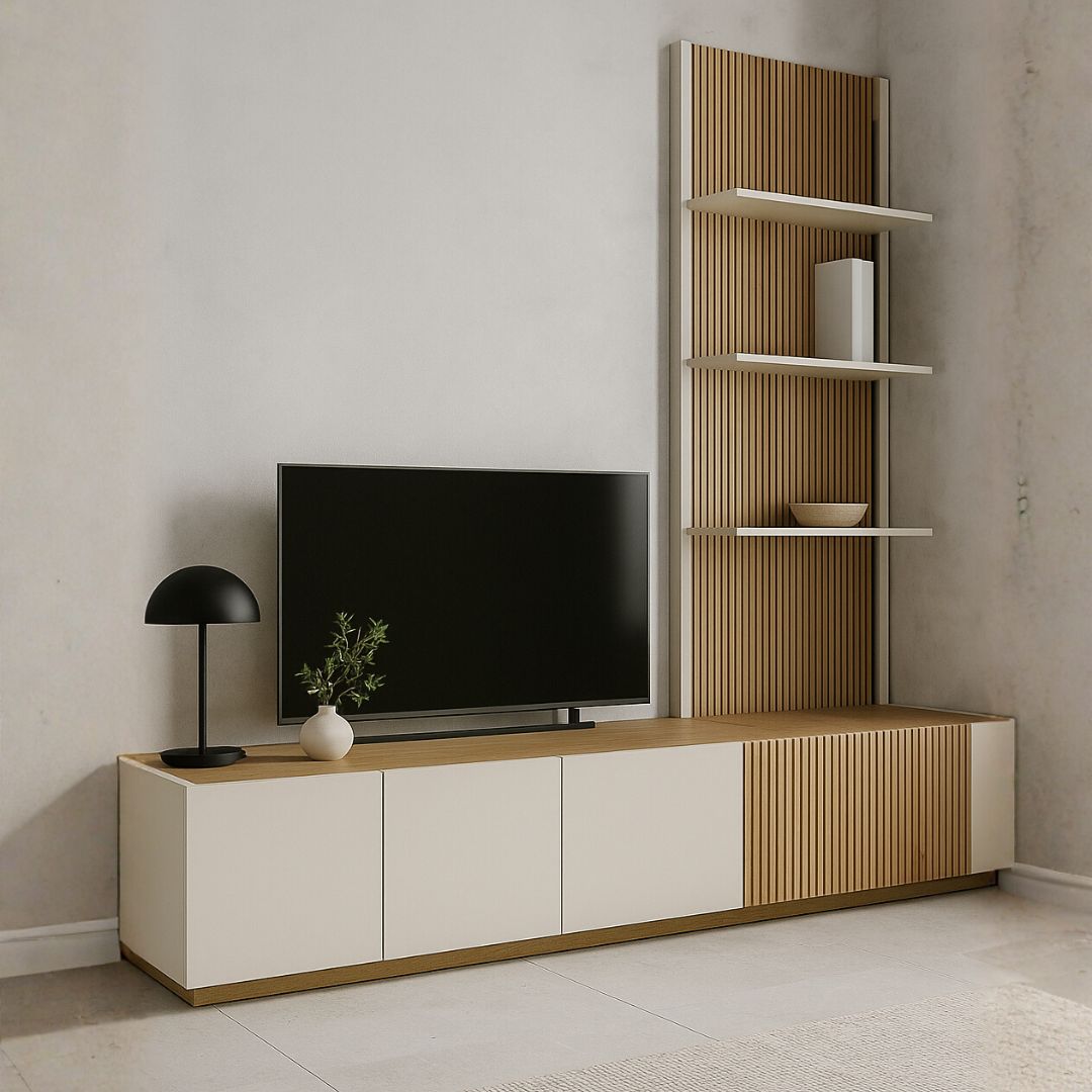 Смарт ТВ комодата овозможува функционално складирање со отворени и затворени делови, идеални за уредно сместување на ТВ опрема, декорации и лични предмети. Со димензии 180 x 40 x 28,5 cm, нуди идеален баланс помеѓу практичност и визуелна леснотија.