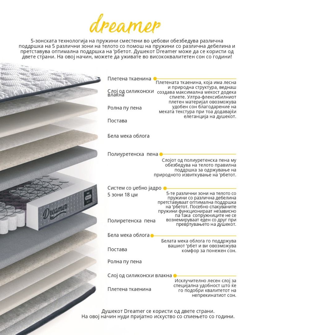 Материјали: Висококвалитетна полиуретенска пена, антибактериско термичко полнење, постава, еластичен сунѓер, силиконска бело-мека памучна волна, антистрес ткаенина