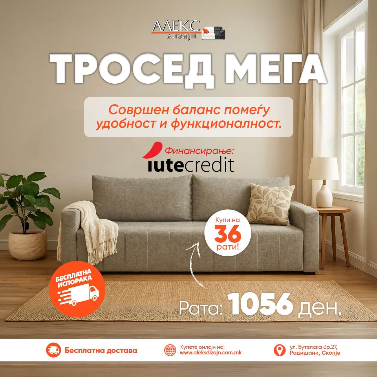 - Бесплатна достава на територија на град Скопје – директно до домашна адреса (освен кога производот се продава без превоз и монтажа).