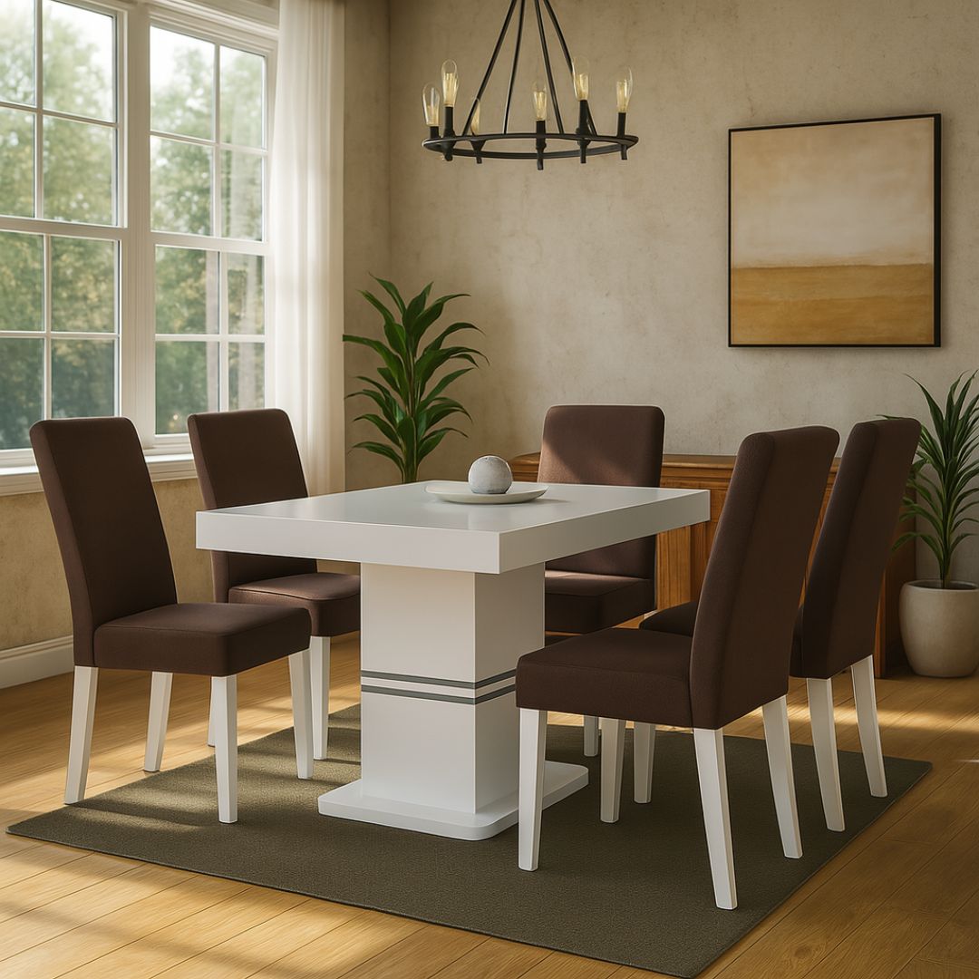 Трпезариска маса СФ131 е совршен избор за оние кои сакаат да комбинираат модерен изглед, практичност и издржливи материјали. Со димензии од 120×90×76 см и механизам за продолжување од +40 см, лесно се прилагодува од секојдневна употреба до поголеми семејни собирања и свечени пригоди.